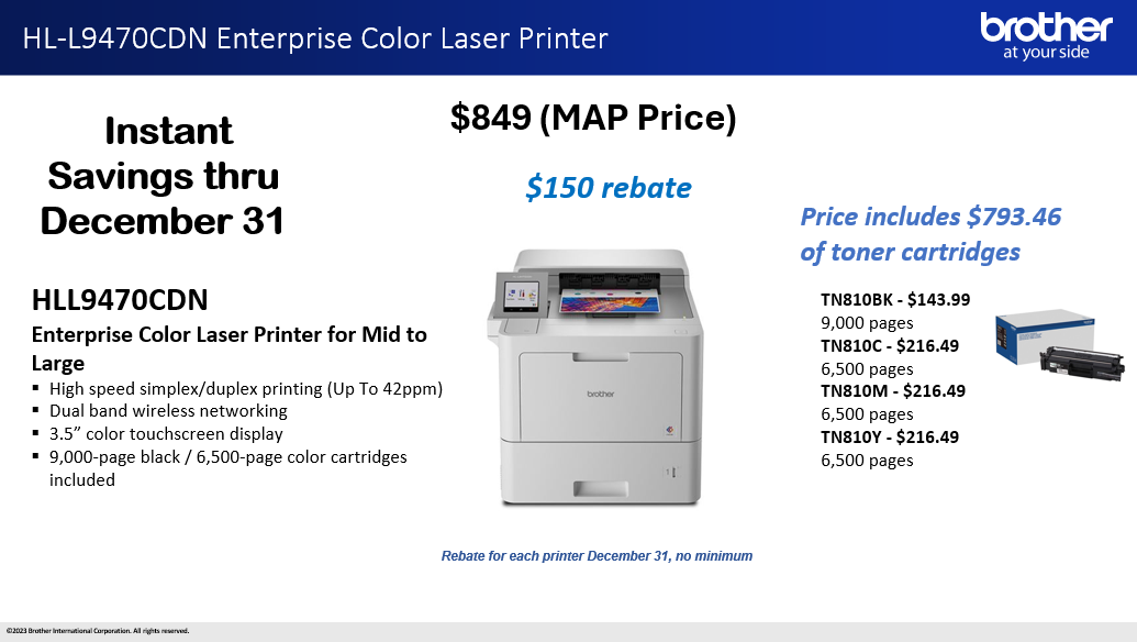 From October 13 - December 31, 2025, earn an instant rebate of $150 per unit on the Brother HL-L9470CDN Enterprise Color Laser Printer.